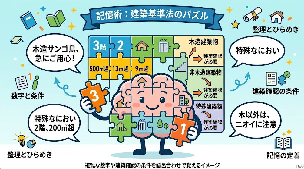 建築基準法の複雑な数字や建築確認の条件を語呂合わせで覚えるイメージ
